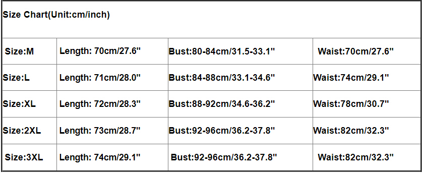 | Size:3XL | Length: 74cm/29.1″ | Bust:92-96cm/36.2-37.8″ | Waist:82cm/32.3″ |