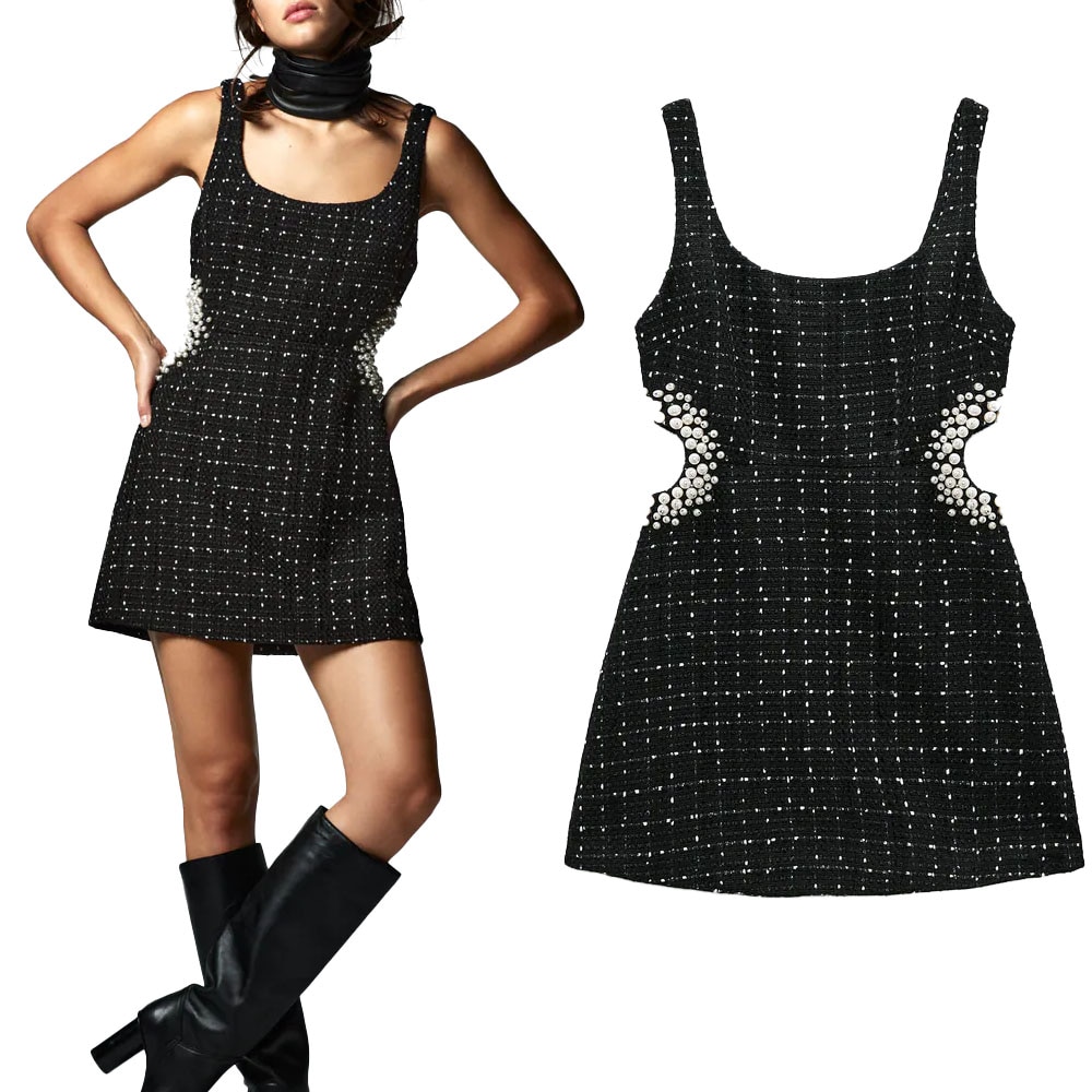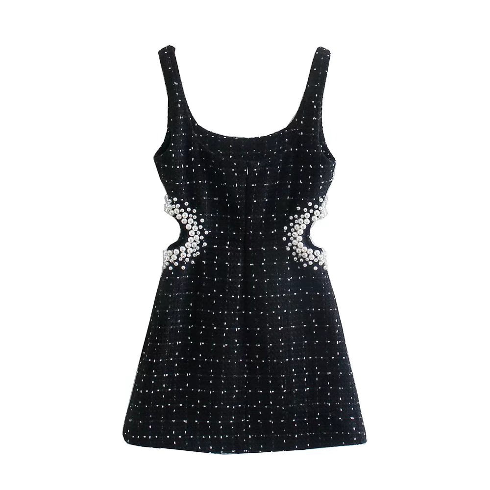 Za Women 2021 Autumn New Chic Fashion Coarse Grain Sling Pearl Mini Dress Vintage With Female Dresses Vestidos
