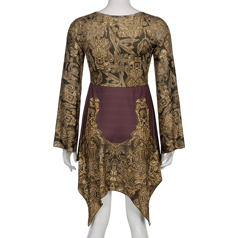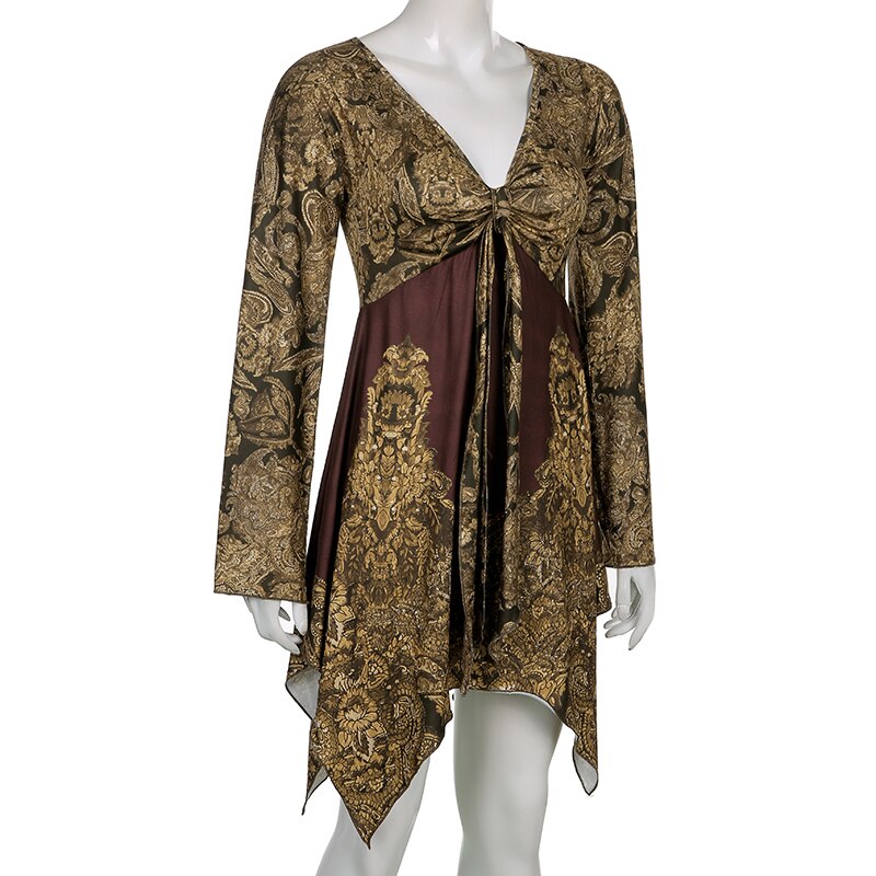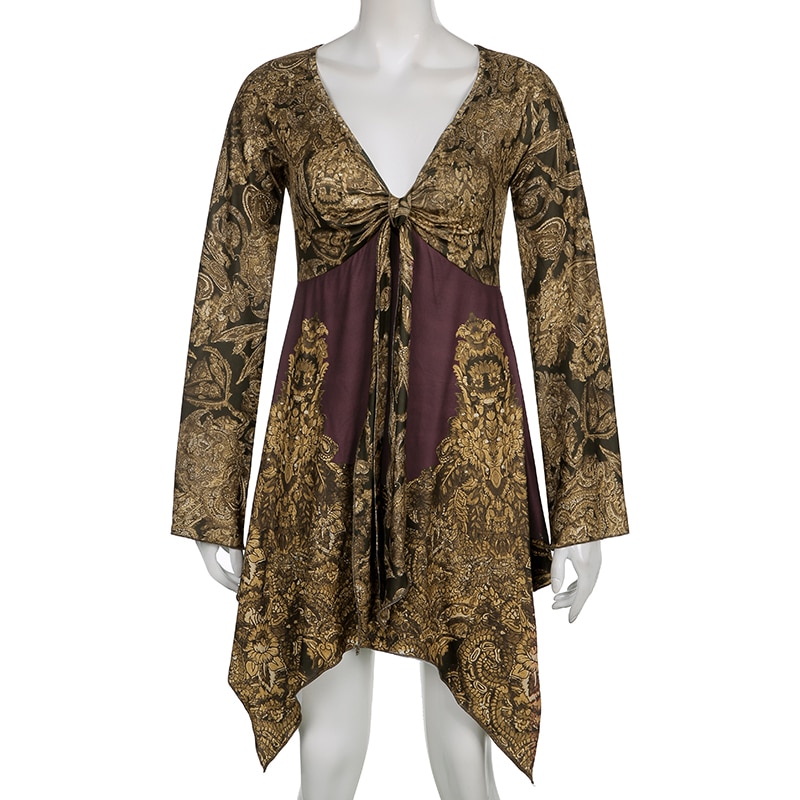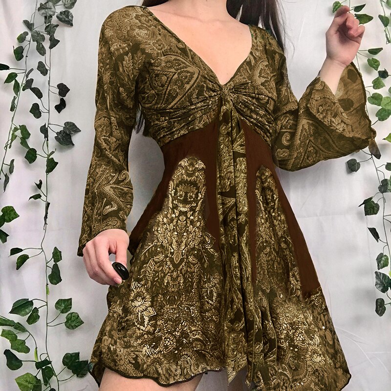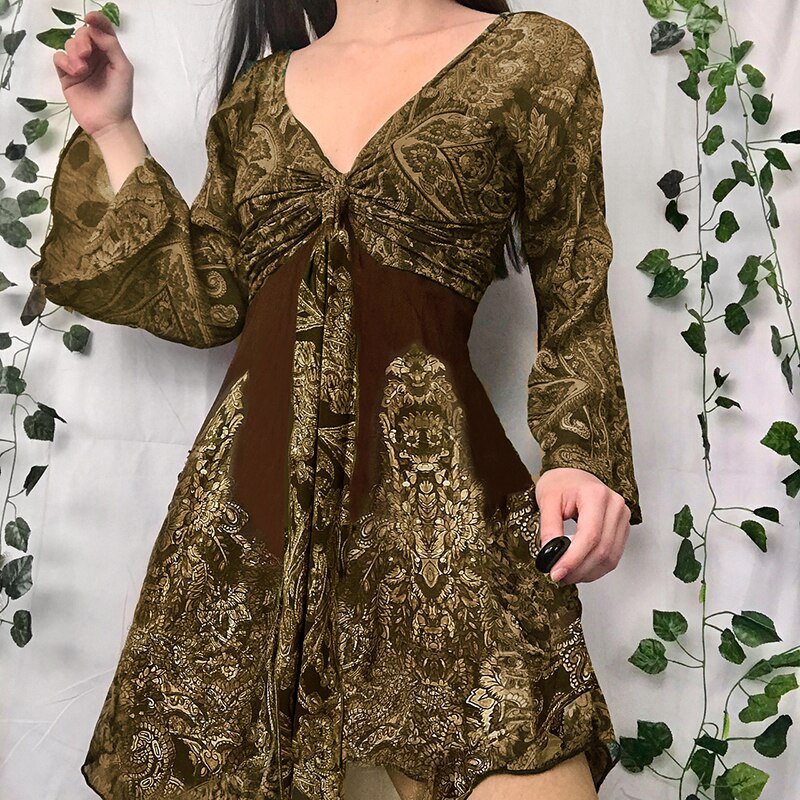 Sweetown Fairycore Grunge Printed Dress Contrast Patches Vintage Aesthetic V Neck Flared Sleeve Elegant Fashion Women Dresses