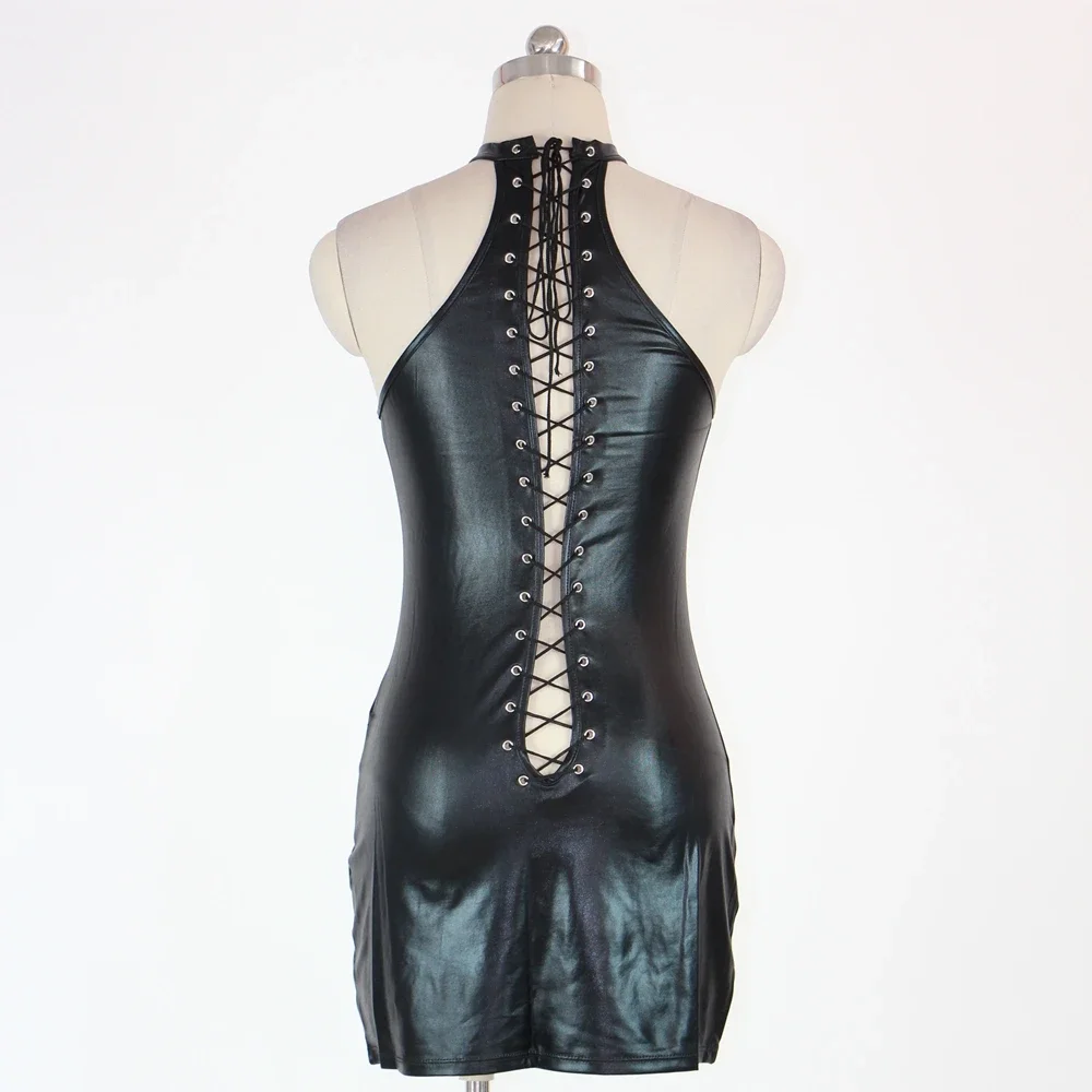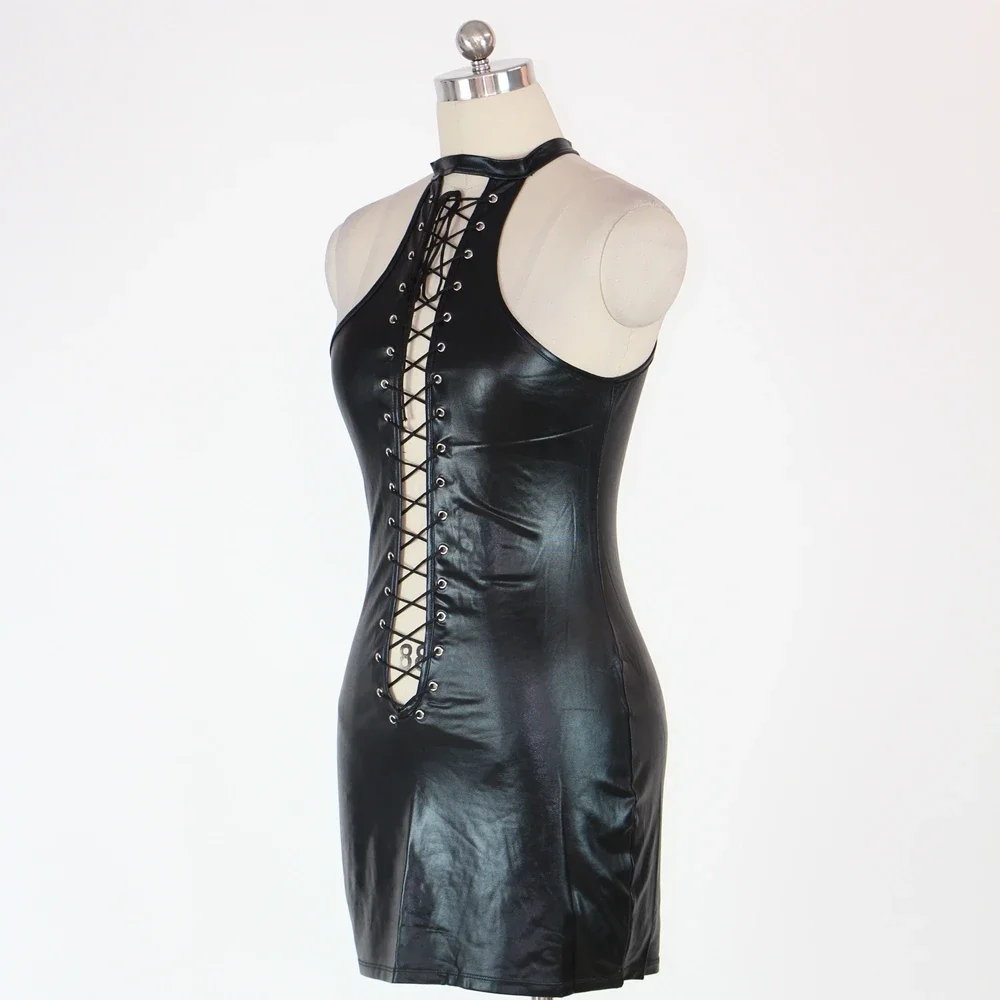 Gothic Lace Up Neck PU Leather Club Halter Dress With Gloves