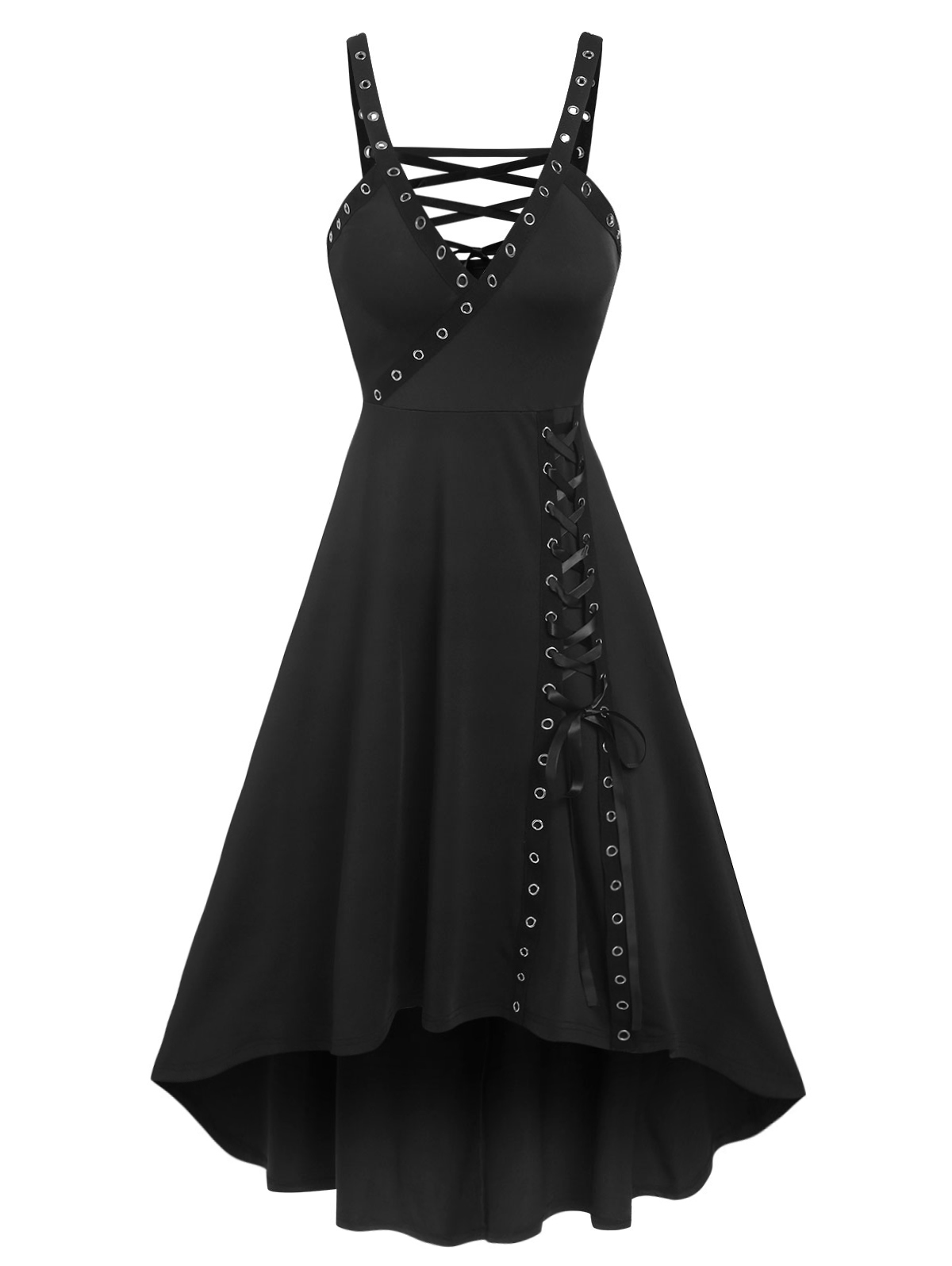 Plunging Neckline Eyelet Lace Up High Low Gothic Dress