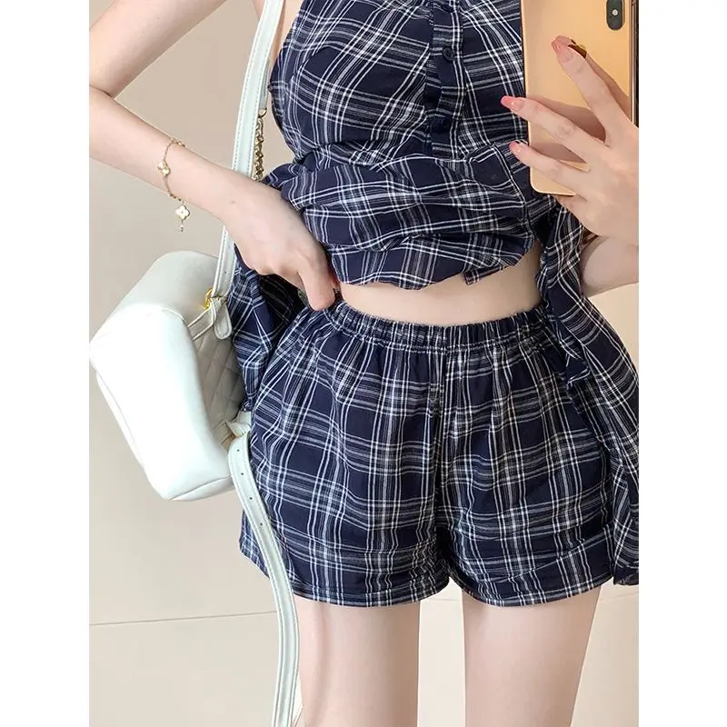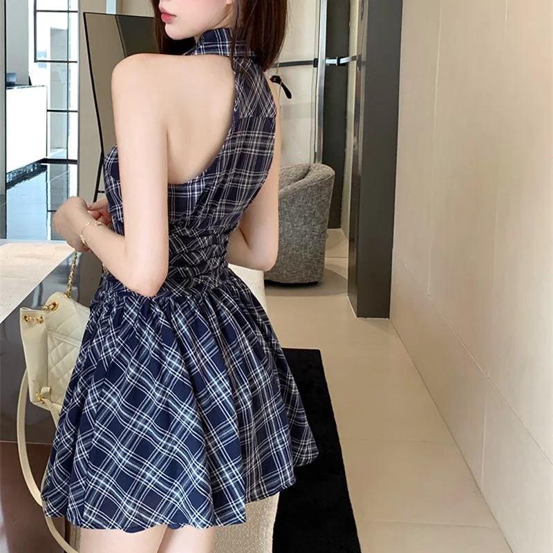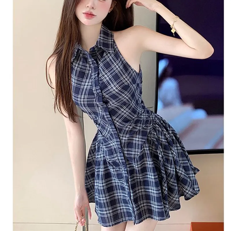 Gothic Summer Plaid Sleeveless Mini Shirt Dress