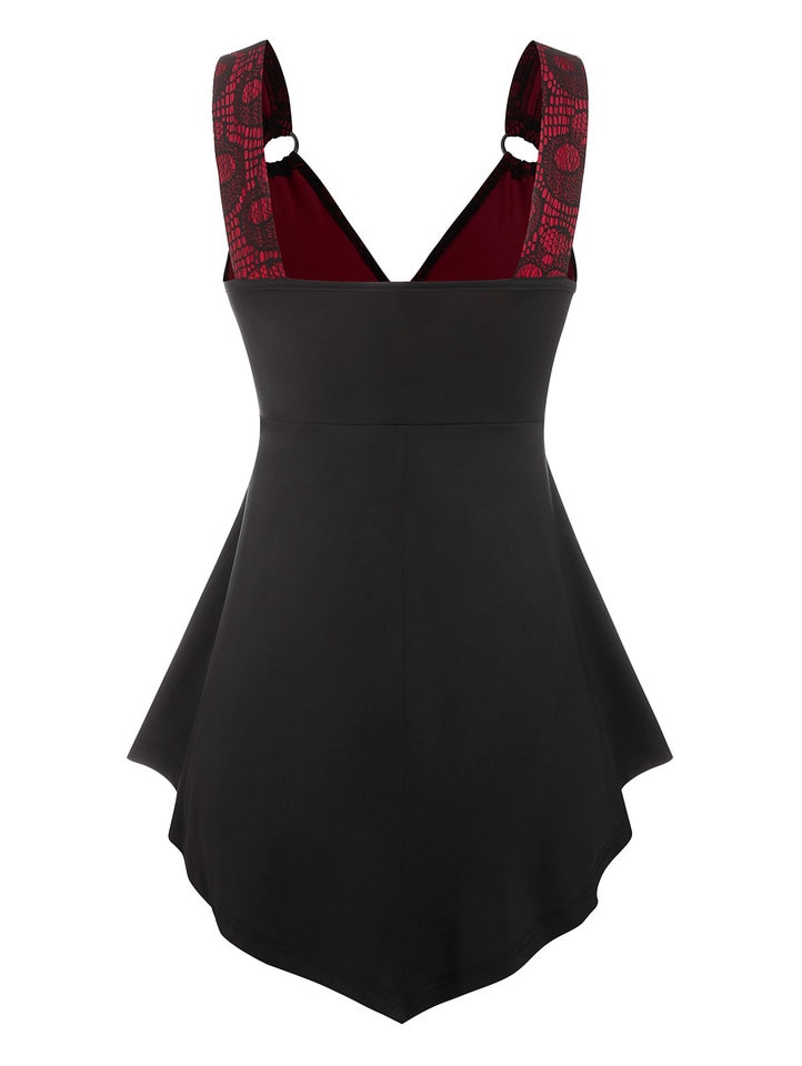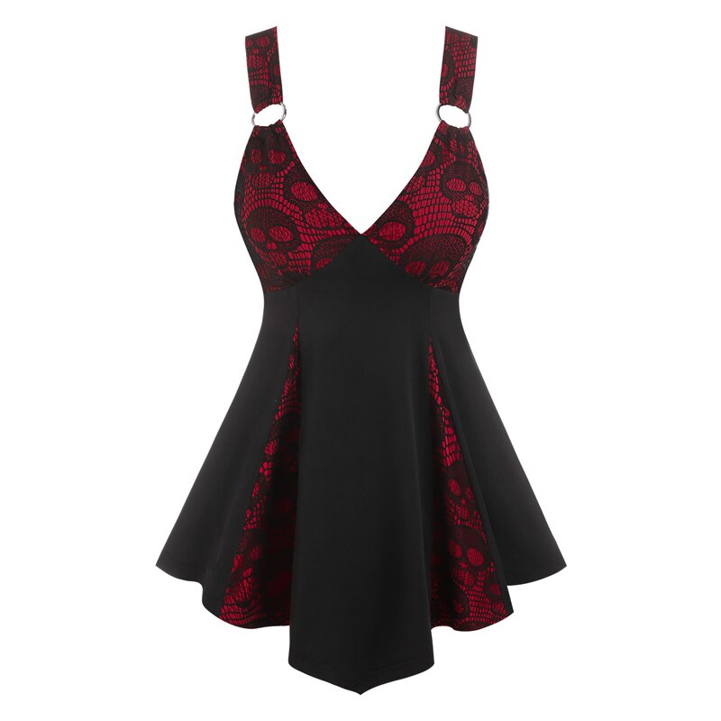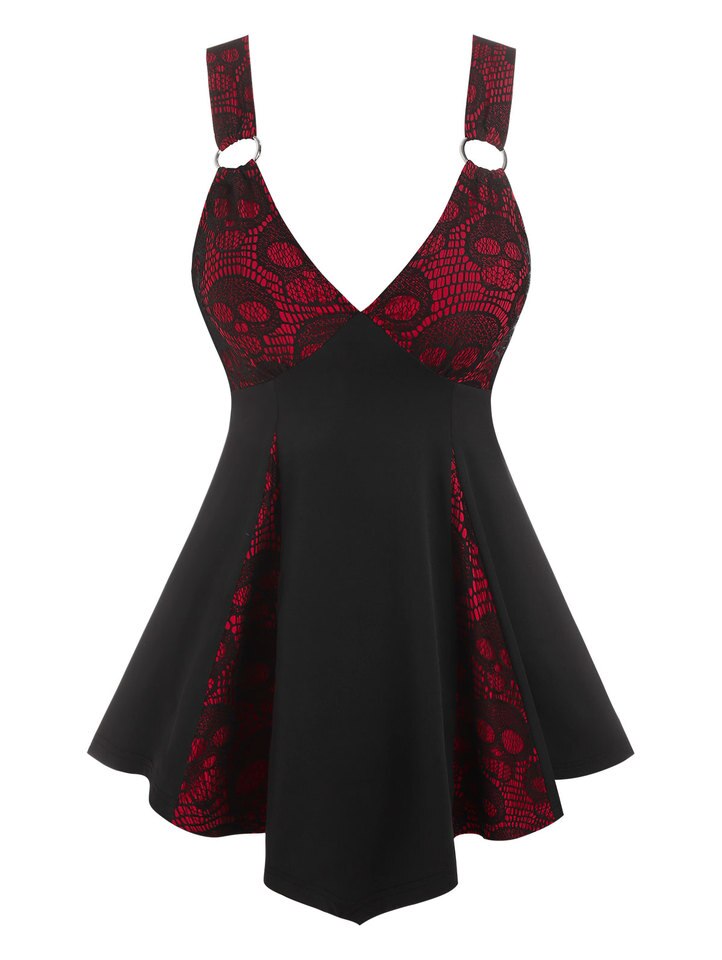 Plunging V Neck Skull Lace Skirted Tank Top