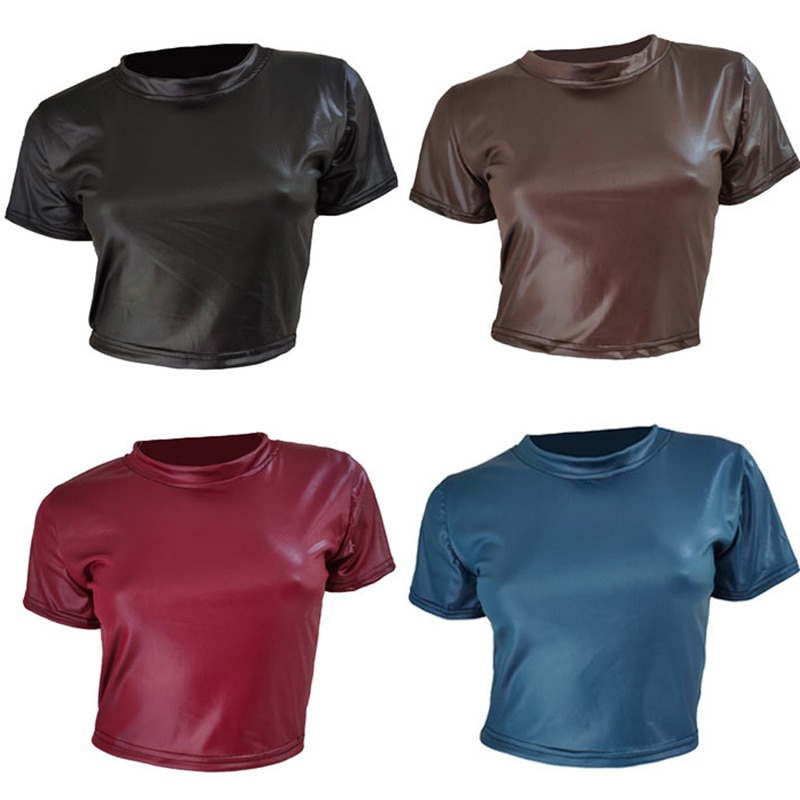 Women Faux Leather T-Shirt Crop Tops Short Sleeve Sexy Punk Midriff Tee Clubwear Women Shirt