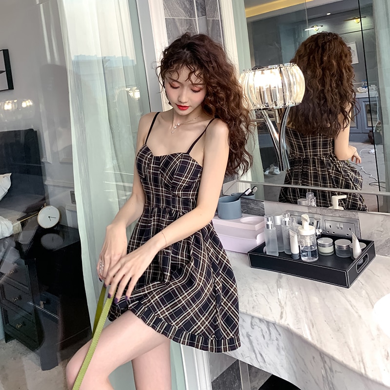 Women Summer Dress Female Vestidos Casual Backless Boho Dresses 2021 Plaid Print Sleeveless Beach Wear Spaghetti Vestidos